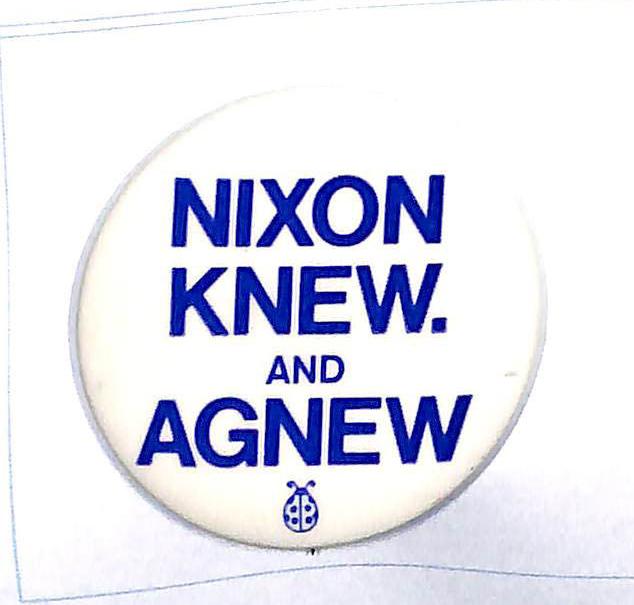 reference to Agnew resignation and now Nixon 1 1/4" cello. $12 Buy Now |